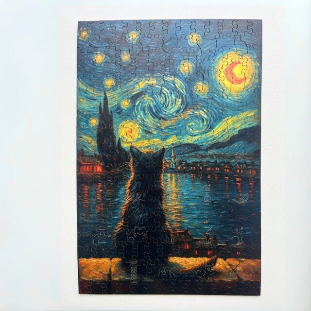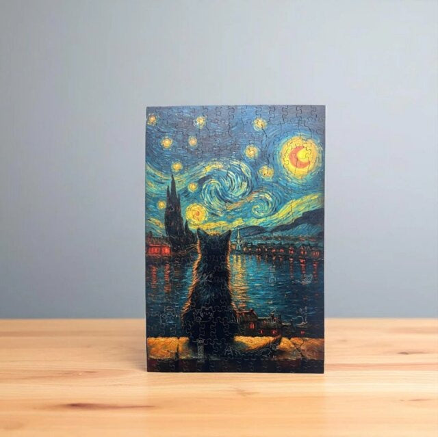 Wirujące wzory na niebie i elegancki kot sprawiają, że puzzle wyglądają jak dzieło sztuki. Uwielbiałam każdą chwilę spędzoną na układaniu ich. Teraz dumnie prezentują się w moim biurze.