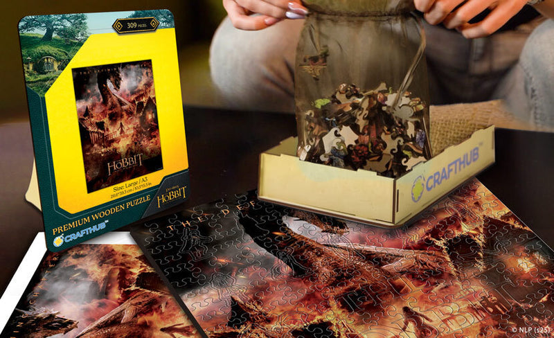 Wyrusz w epicką podróż przez Śródziemie z puzzlami w kształcie Bilbo, Gandalfa, Golluma, smoka Smauga, Jedynego Pierścienia i legendarnych symboli z Hobbita.
