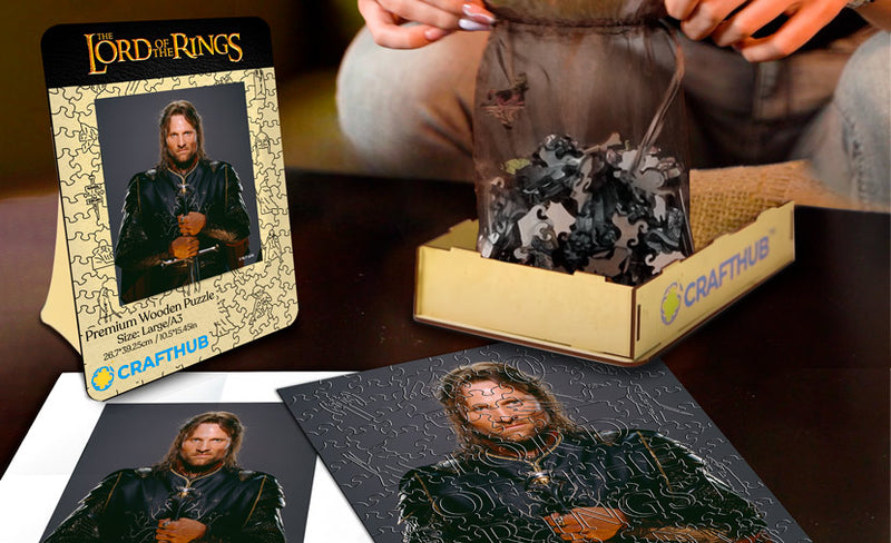 "Nie wszyscy, którzy wędrują, są zagubieni”. Ta układanka przedstawia Aragorna. Intensywność w jego oczach odzwierciedla jego determinację i gotowość do podjęcia swojego przeznaczenia jako króla Gondoru.