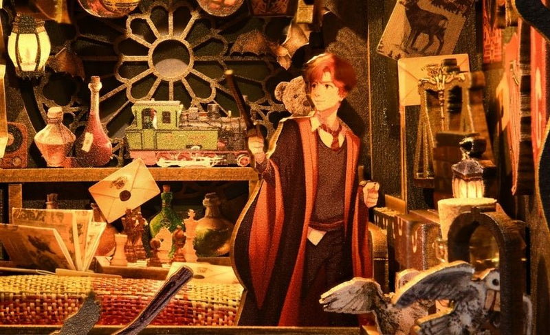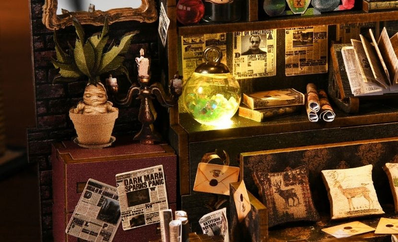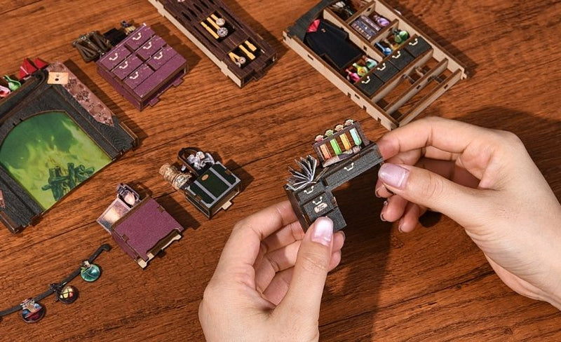 Każda rzeźbiona półka, butelka z eliksirem i zaczarowany symbol są wykonane z precyzyjnie ciętego drewna, oddając istotę tajemniczej komnaty alchemika.