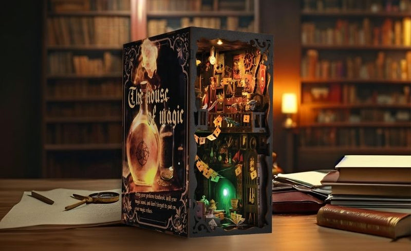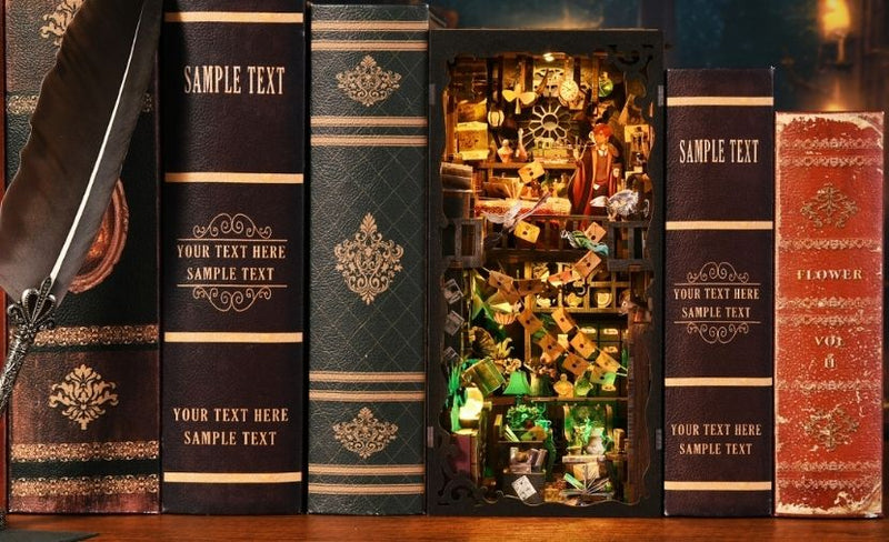 Ten kącik biblioteczny, stylizowany na oprawioną w twardą okładkę książkę, skrywa w sobie fantazyjny świat alchemika – idealny jako magiczna ozdoba półki lub gabinetu.
