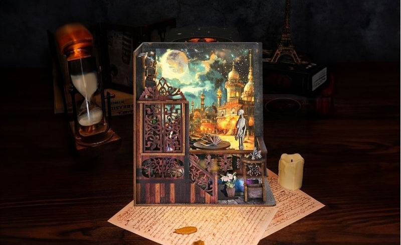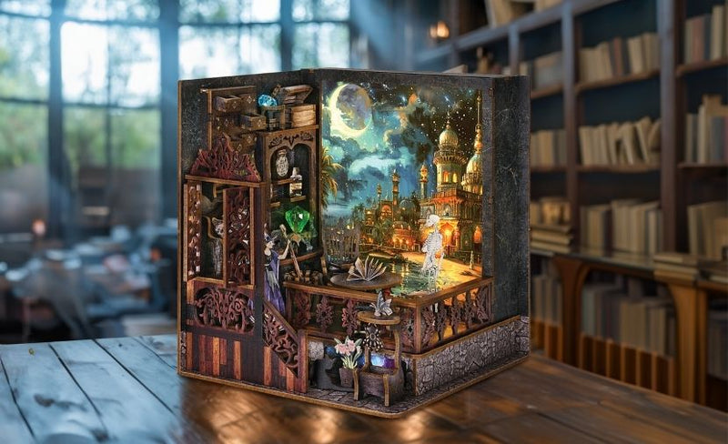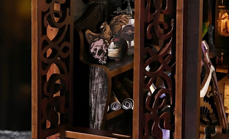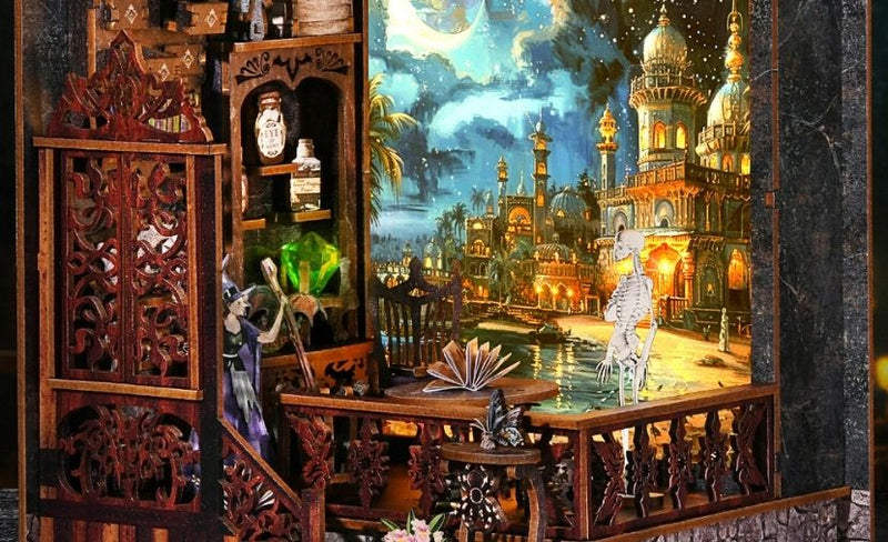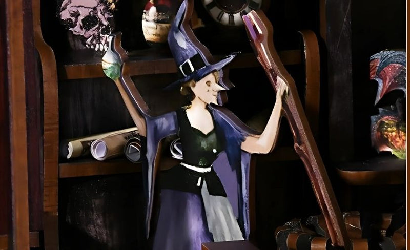 Każda brama, mikstura i rzeźbiony wzór są wykonane z precyzyjnie ciętego drewna, ożywiając magiczną scenę uliczną dzięki misternym detalom.