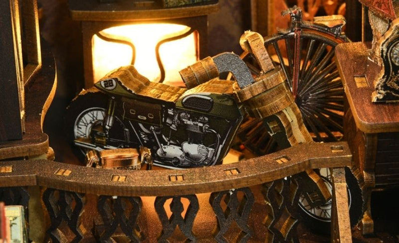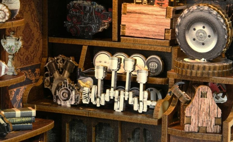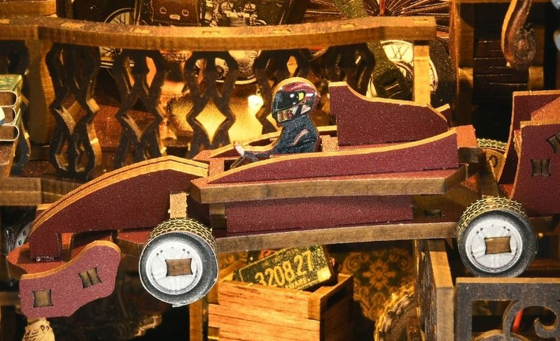 Każda przekładnia, koło i silnik są wyrzeźbione z precyzyjnie ciętego drewna, odtwarzając autentyczny klimat vintage’owego garażu.