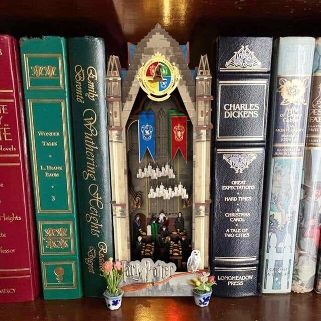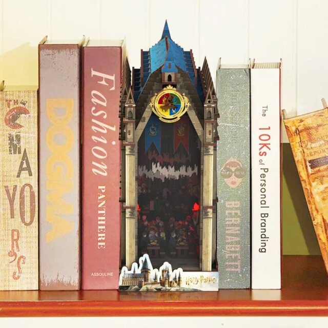 Makieta Wielkiej Sali natychmiast przeniosła mnie do Hogwartu. Sztandary i świece tworzą niesamowity klimat, dzięki czemu całość wydaje się żywa. To jak mieć kawałek zamku w swojej bibliotece.